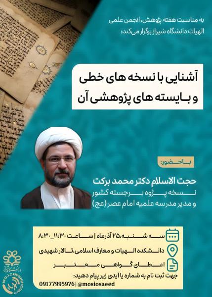 ارائه‌دهنده: حجت‌الاسلام دکتر محمد برکت نسخه‌پژوه برجسته کشور مدیر مدرسه علمیّه امام عصر(عج)